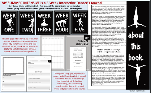 Interactive Book Author, Frank Harlan presents MY SUMMER INTENSIVE is an interactive daily journal for student dancers who are attending a 5-week Summer Intensive Dance Program with a professional dance company. It was created to capture a student dancer’s Summer Intensive Experience. Daily Questions and Prompts invite the student dancers to share their thoughts and perspectives and the end of each day of dance activities. It provides them with a place to start. And helps them to recall the highlights and success of their day.